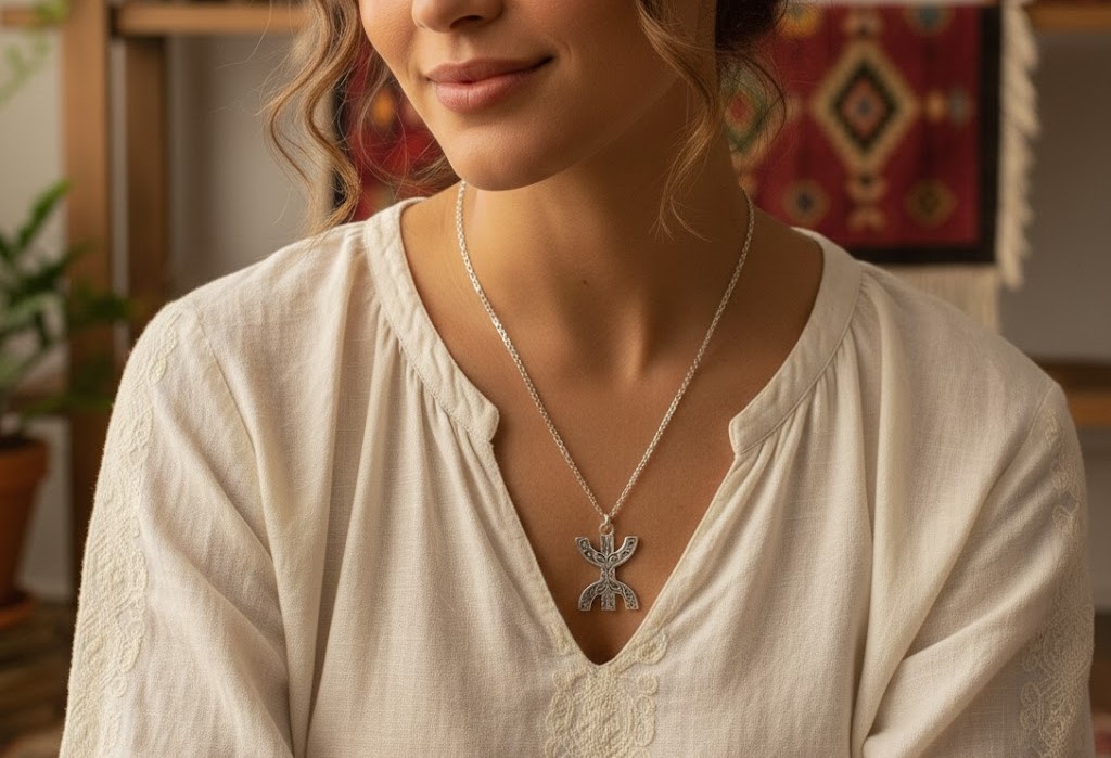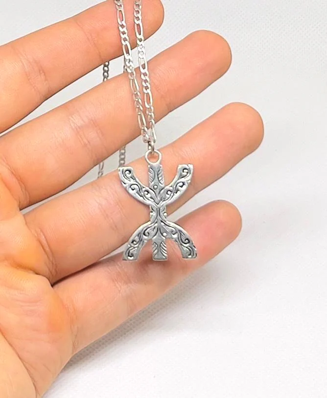 A handcrafted Amazigh Berber sterling silver necklace featuring the iconic Moroccan freedom symbol. A meaningful ethnic piece celebrating Amazigh identity, culture, and artisanal craftsmanship.