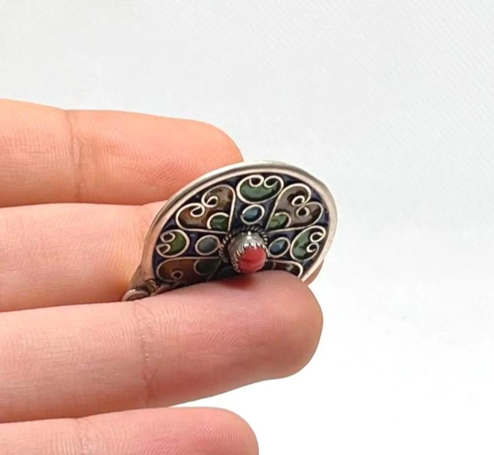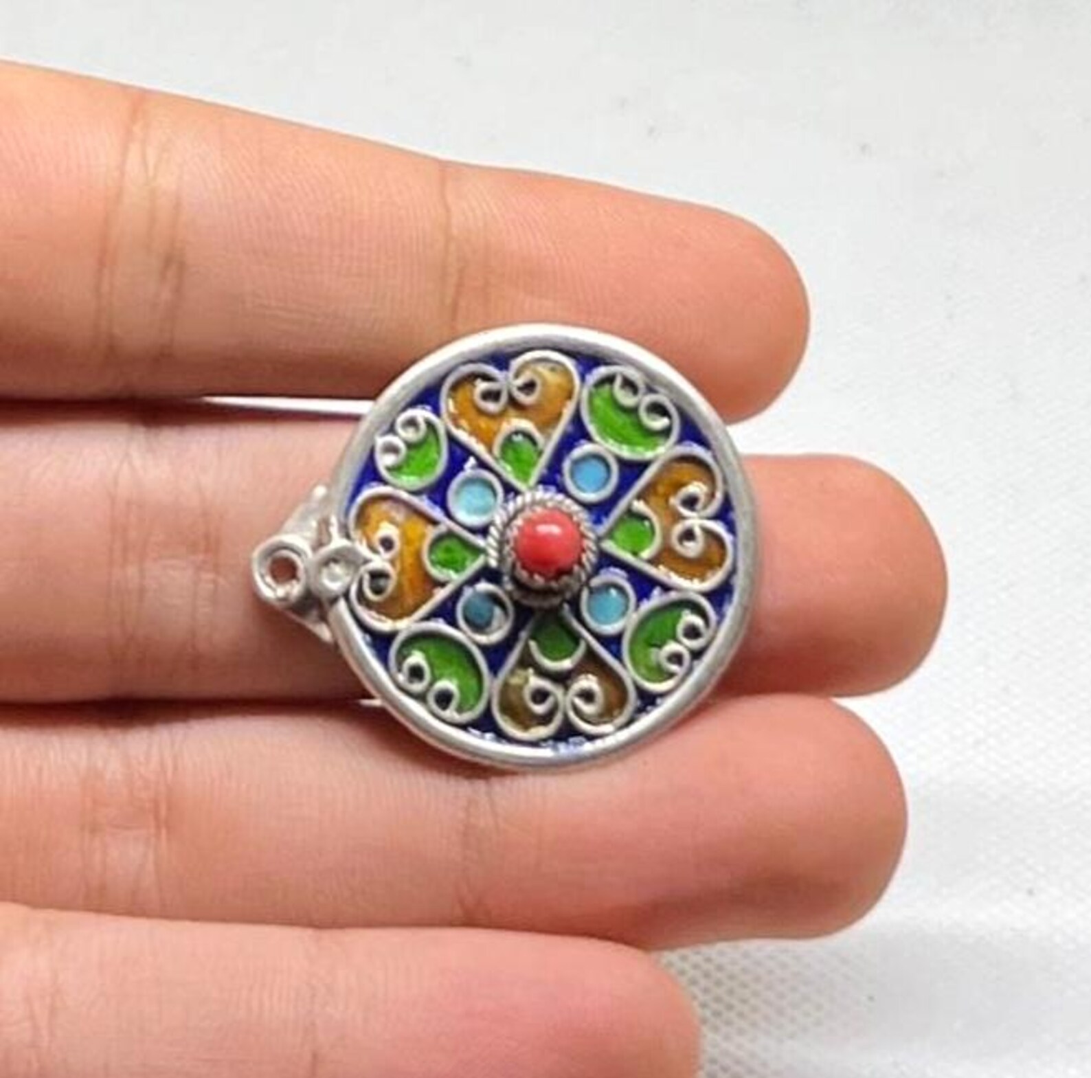 This Amazigh Coral Pendant is an authentic piece of Kabyle Moroccan Berber jewelry. Handcrafted using traditional silversmithing techniques passed down through generations. Made from solid sterling silver. The pendant is beautifully decorated with colorful enamel work and coral accents that reflect the cultural depth and artistic heritage of North Africa.