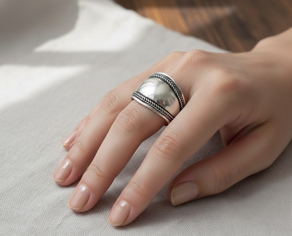 Made from high-quality sterling silver, the band offers a smooth, comfortable fit suitable for daily wear. Its bold yet minimalist design makes it perfect for both men and women who appreciate authentic craftsmanship and ethnic jewelry with meaning.