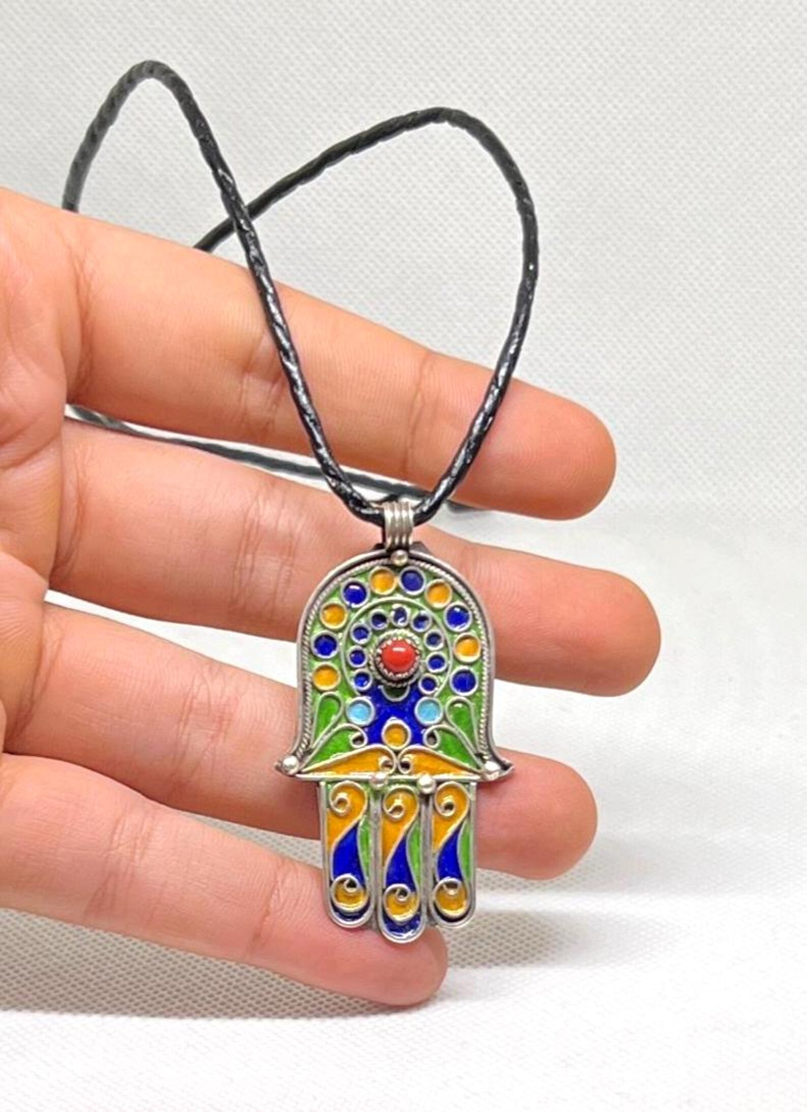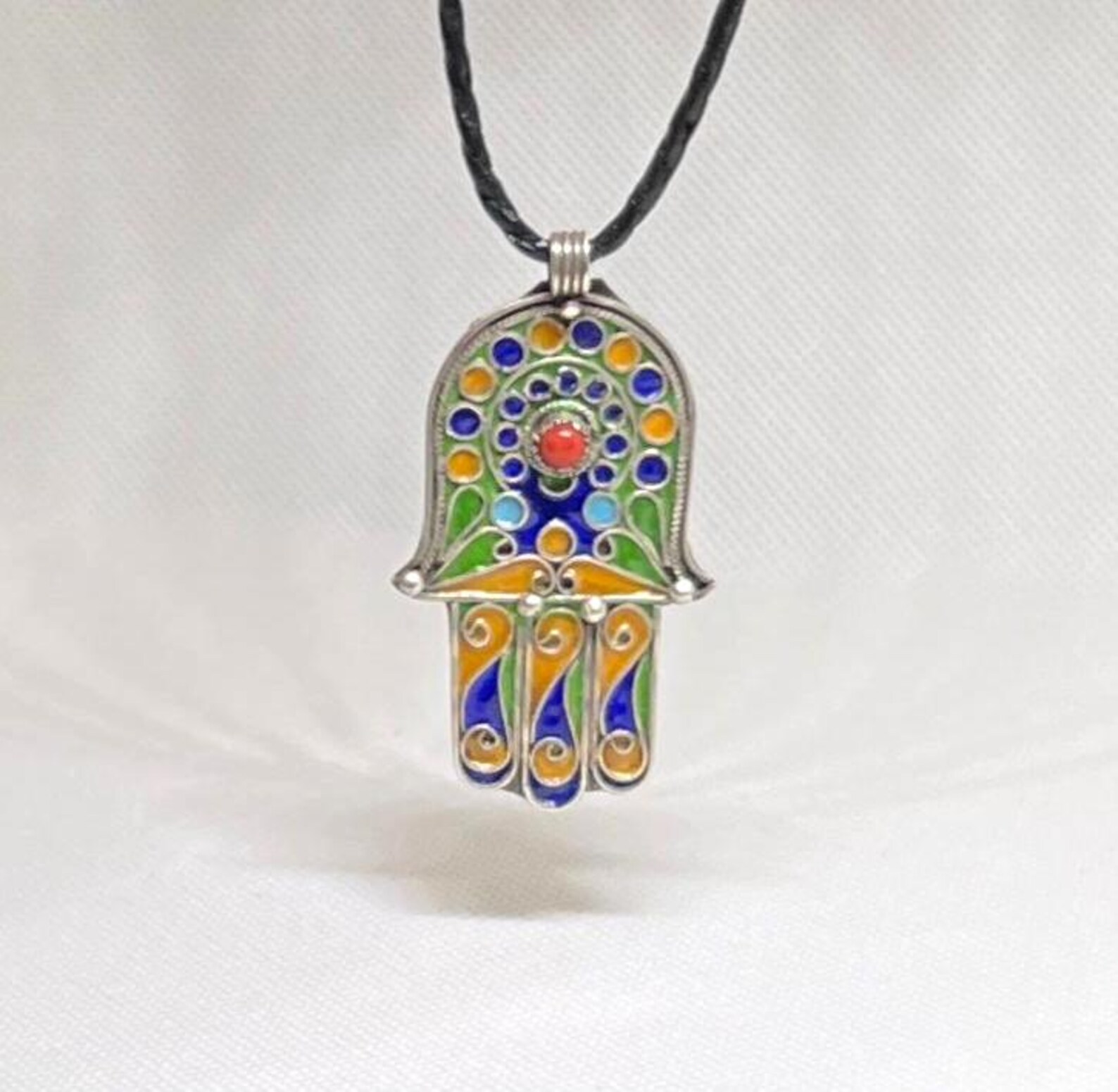 This Berber Coral Necklace features a beautifully handcrafted Hamsa Hand pendant made from solid sterling silver, enriched with traditional enamel work and natural coral accents. Created by skilled Moroccan artisans, this piece blends Amazigh, Berber, and Judaica symbolism into one powerful cultural talisman.