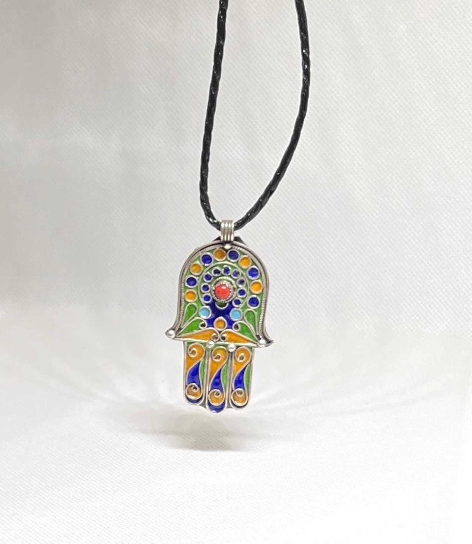 Authentic Berber Coral Necklace with enamel Hamsa Hand pendant. Handmade sterling silver Moroccan jewelry symbolizing protection and heritage.