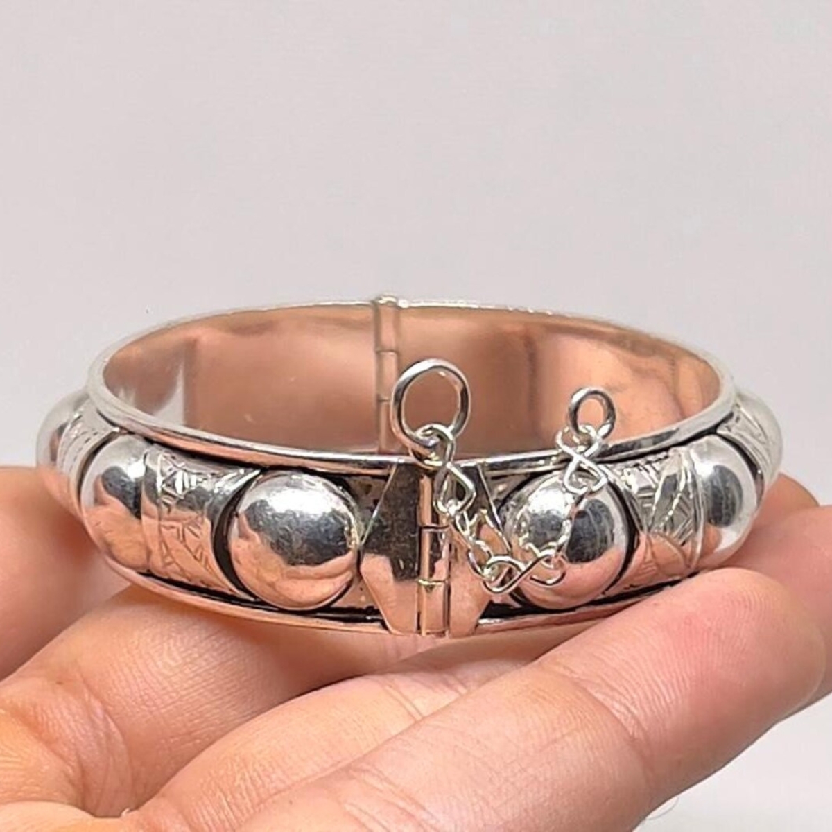 This Berber cuff bracelet is handcrafted in Morocco from sterling silver, featuring engraved tribal patterns and decorative silver balls. With its adjustable open cuff design, it blends boho, ethnic, and traditional Berber style, making it a meaningful unisex jewelry piece.