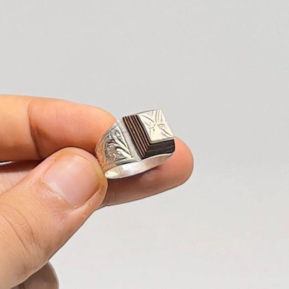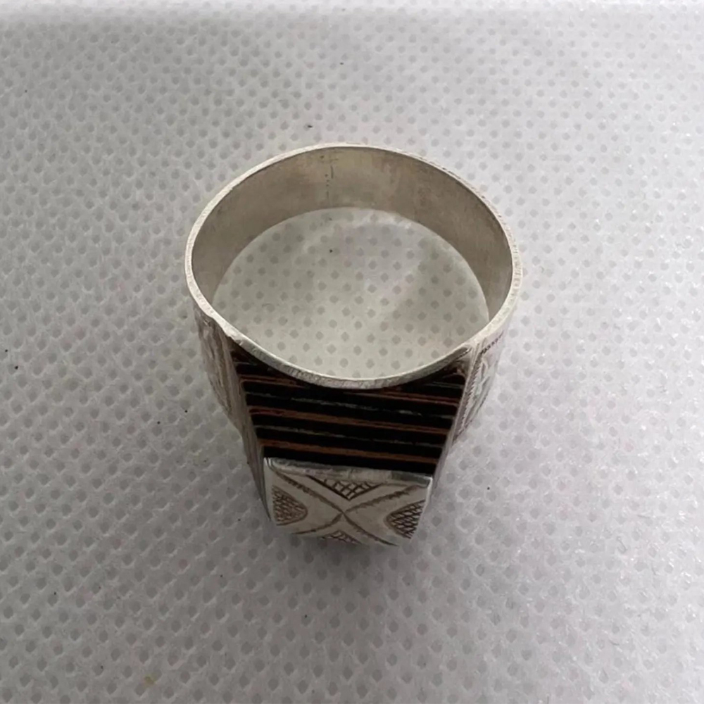 Handmade Tuareg sterling silver ring with ebony wood inlay, crafted by Berber artisans from southern Morocco. Ethnic tribal jewelry with engraved Tuareg design inspired by Sahara Touareg style. Weight 7.35 grams.
