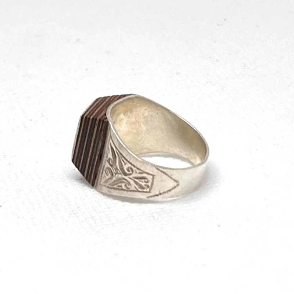 This Handmade Sterling Silver Tuareg Ring is an African handmade sterling silver ring decorated with Tuareg design. The ring features ebony wood inlay and engraved tribal style details that reflect traditional Tuareg craftsmanship.
