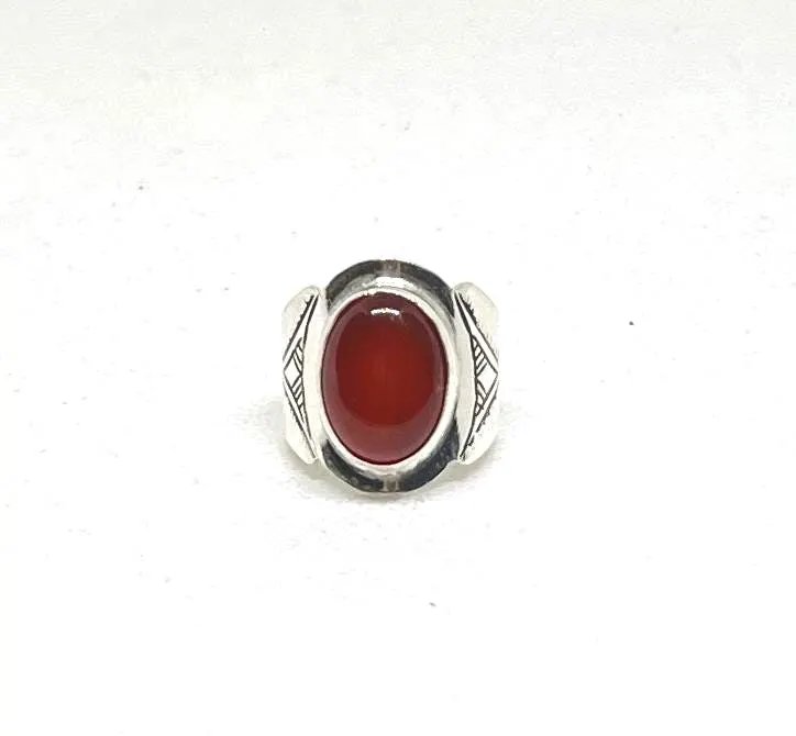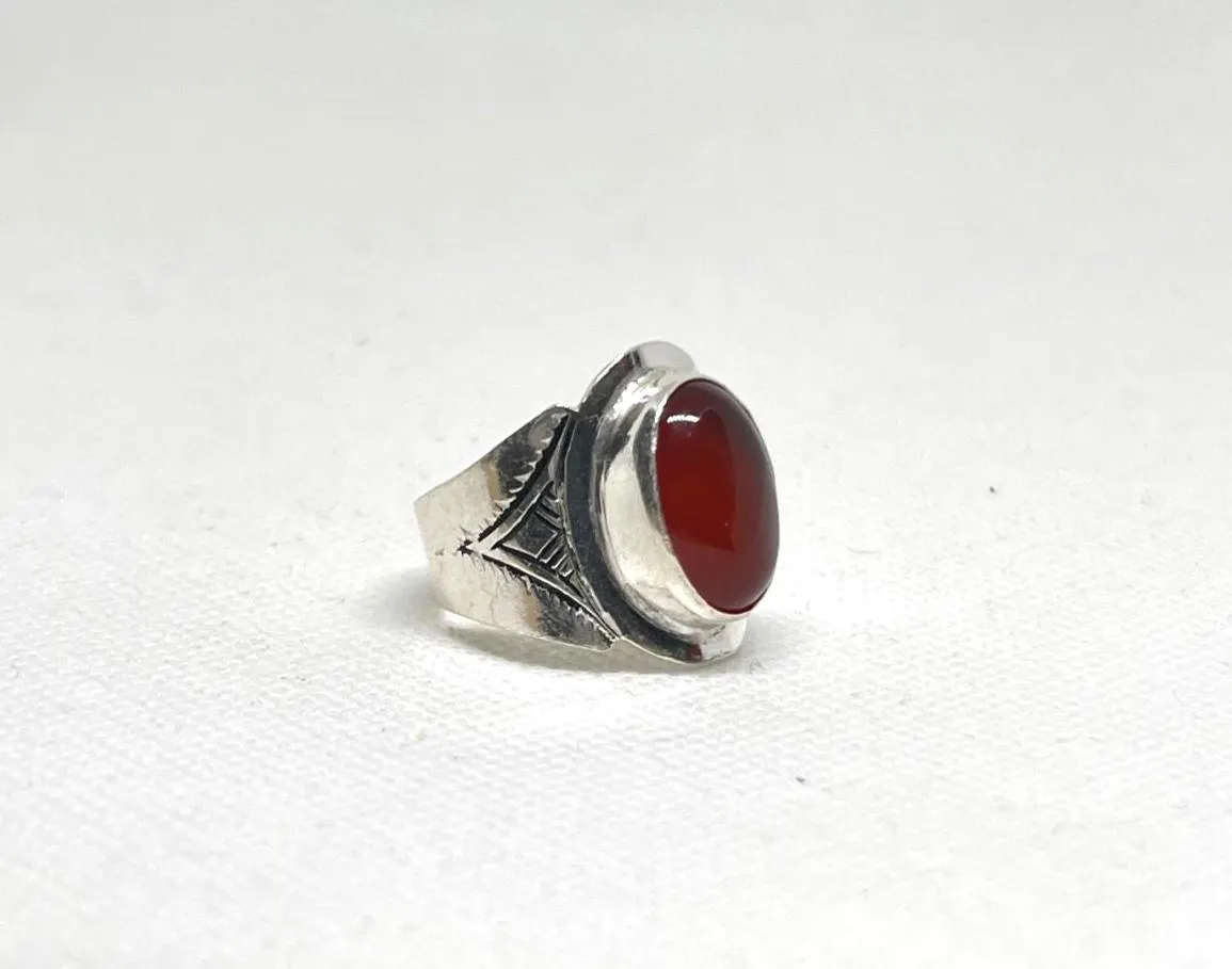 Add a touch of authentic North African craftsmanship to your style with this Moroccan Handmade Silver Carnelian Ring, a stunning piece of Tuareg Berber engraved tribal jewelry.