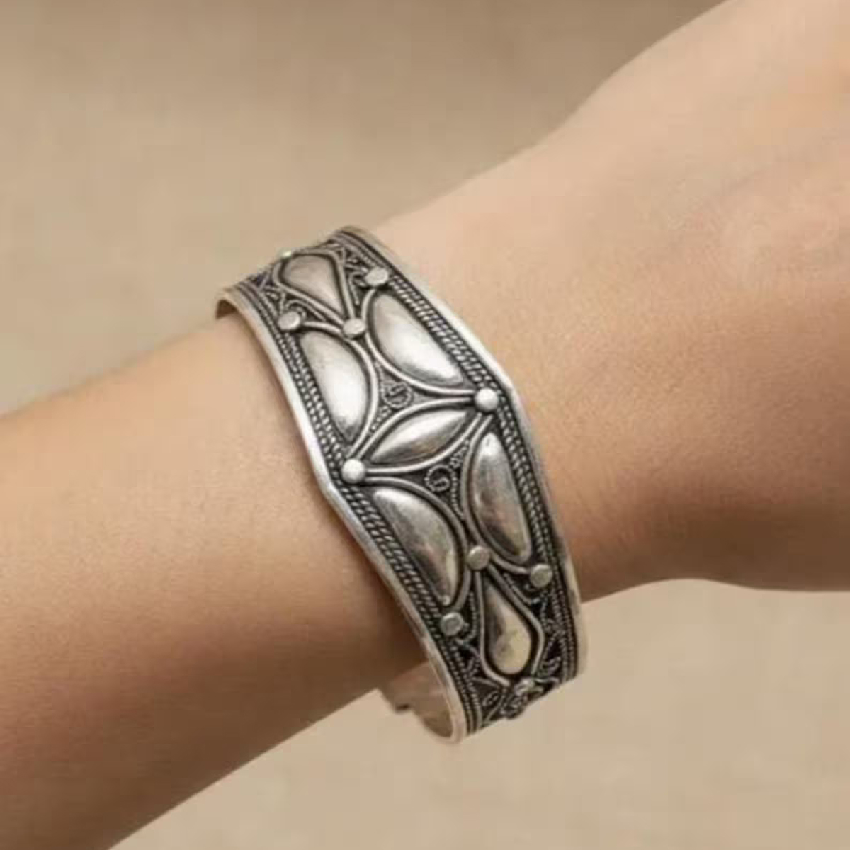 This handmade Moroccan sterling silver cuff bracelet is a beautiful example of authentic Berber (Amazigh) and Tuareg craftsmanship. Created by skilled artisans in the Sahara region, it reflects cultural heritage, strength, and timeless elegance.