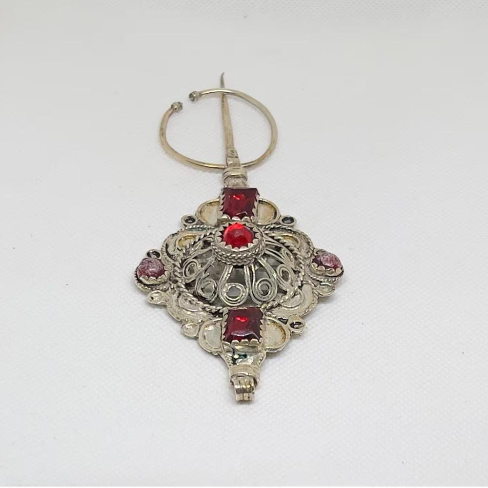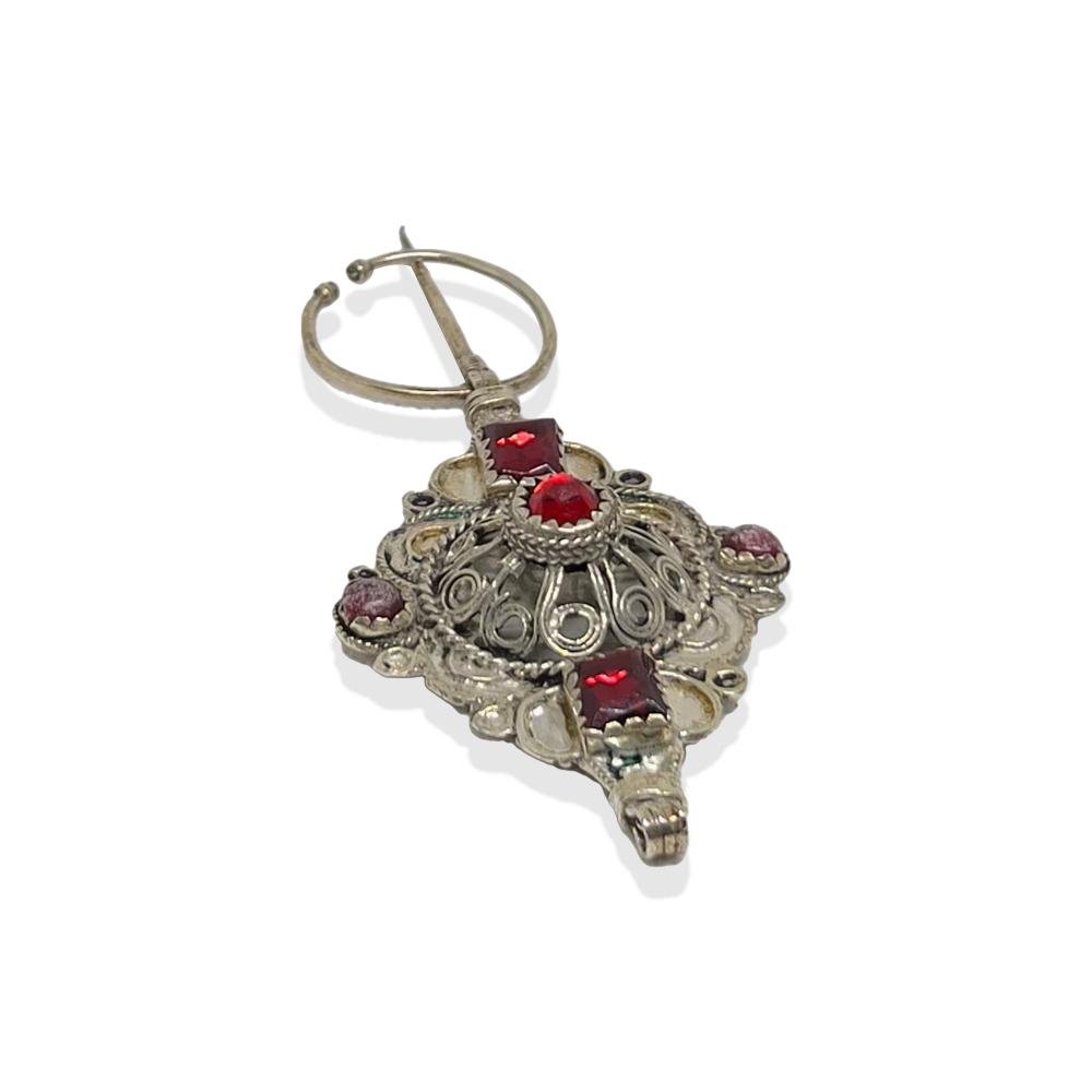 Moroccan Silver Fibula – Antique Berber Tribal Brooch with Glass Beads