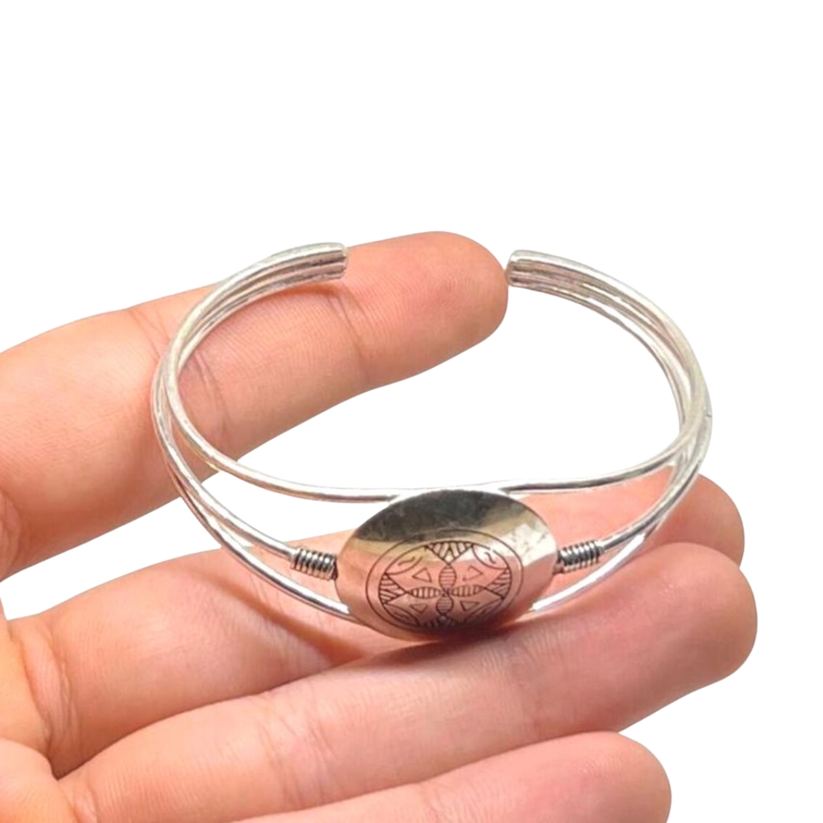 This silver Berber bracelet is handcrafted in Morocco from sterling silver with engraved tribal and spiral motifs. Designed in an adjustable open cuff style, it blends boho, ethnic, and traditional Berber symbolism, making it a meaningful unisex jewelry piece.