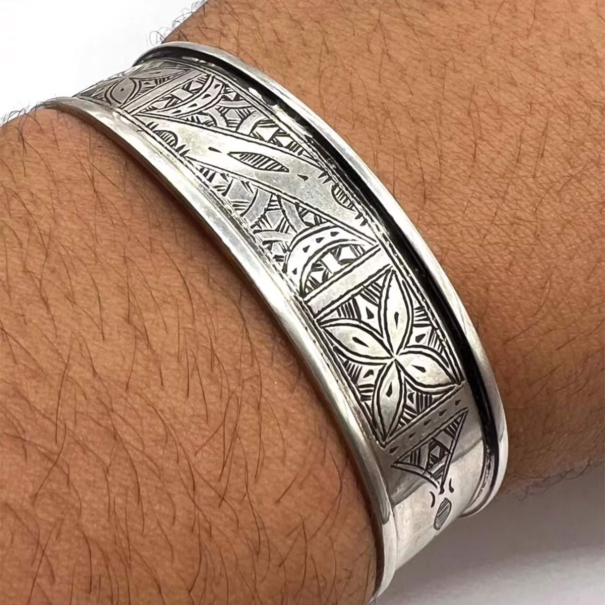 Celebrate the bold beauty of Saharan craftsmanship with this sterling silver Tuareg cuff bracelet, inspired by traditional Amazigh (Berber) jewelry. Handcrafted and engraved with authentic tribal motifs, this piece reflects the rich cultural heritage of Tuareg artisans from Niger and Mali.