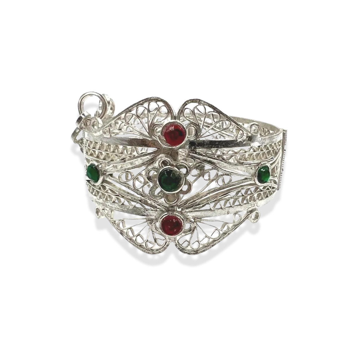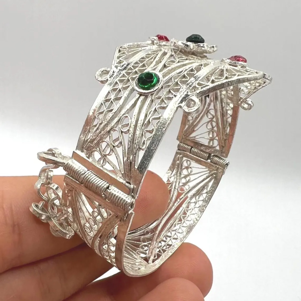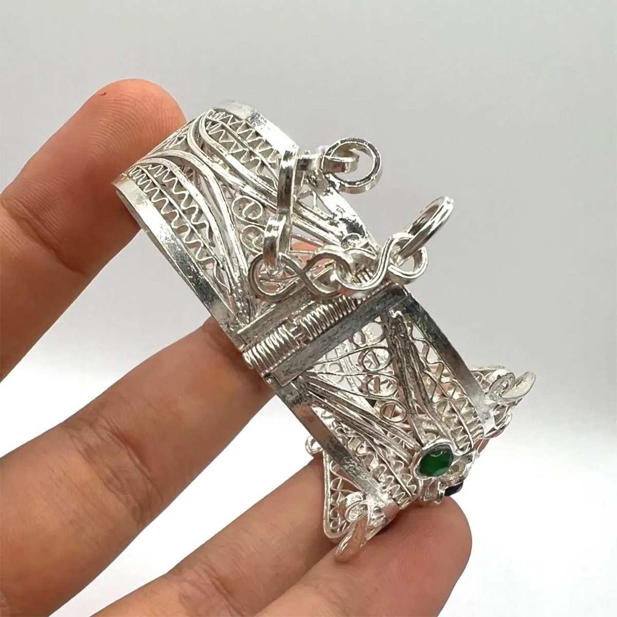 The delicate metalwork showcases fine engraved patterns that have been passed down through generations of Berber silversmiths. Known for their refined filigree techniques, Kabyle artisans create jewelry that blends cultural symbolism with timeless beauty.