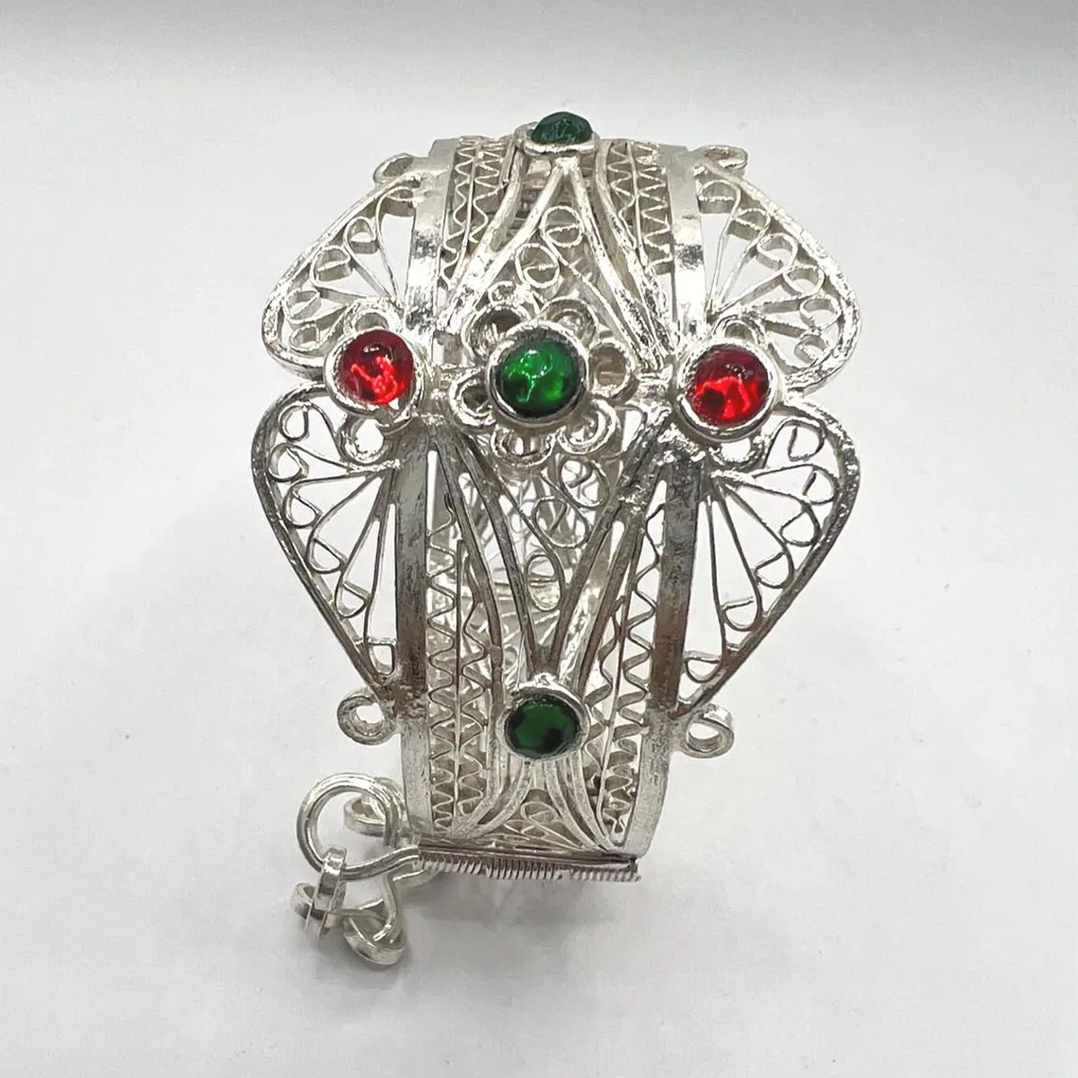 Celebrate the elegance of North African craftsmanship with this vintage Berber filigree cuff bracelet, inspired by traditional Kabyle jewelry designs. Handcrafted with intricate filigree detailing, this silver-plated bracelet reflects the artistic heritage of Amazigh artisans from Morocco.